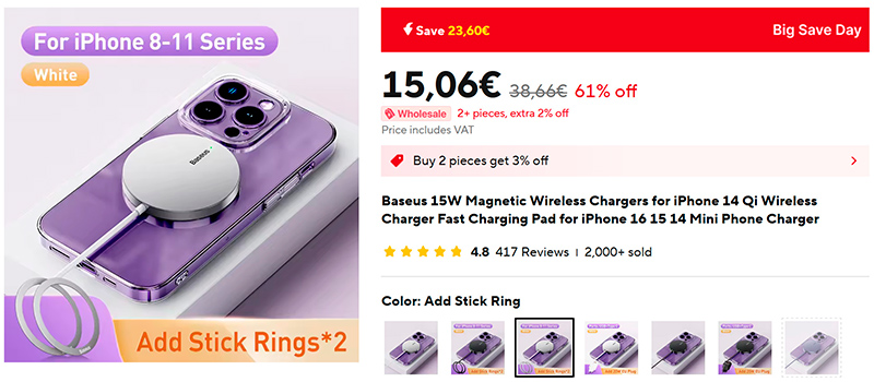 Беспроводную магнитную зарядку взял вот эту от Baseus (ссылка для РФ). 15 Вт для зарядки ночью - самое оно, больше не нужно. Там есть вариант комплектации с магнитными кольцами: такое кольцо нужно прикрепить к чехлу смартфона, поддерживающего беспроводную зарядку, и с ним можно будет использовать магнитные адаптеры и аккумуляторы.