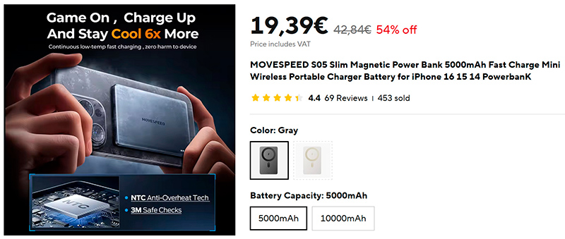 Магнитный аккумулятор взял вот такой - сверхтонкий от Movespeed (ссылка для РФ) на 5000 мАч - мне для дороги достаточно. Если нужна емкость побольше, то там же есть аналогичный аккумулятор на 10000 мАч. Кстати, у меня это уже будет четвертый внешний аккумулятор данного производителя - очень они мне нравятся, работают отлично, емкость всегда соответствует заявленной, я проверяю.