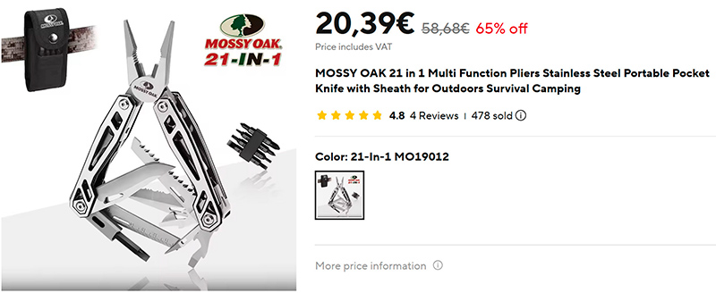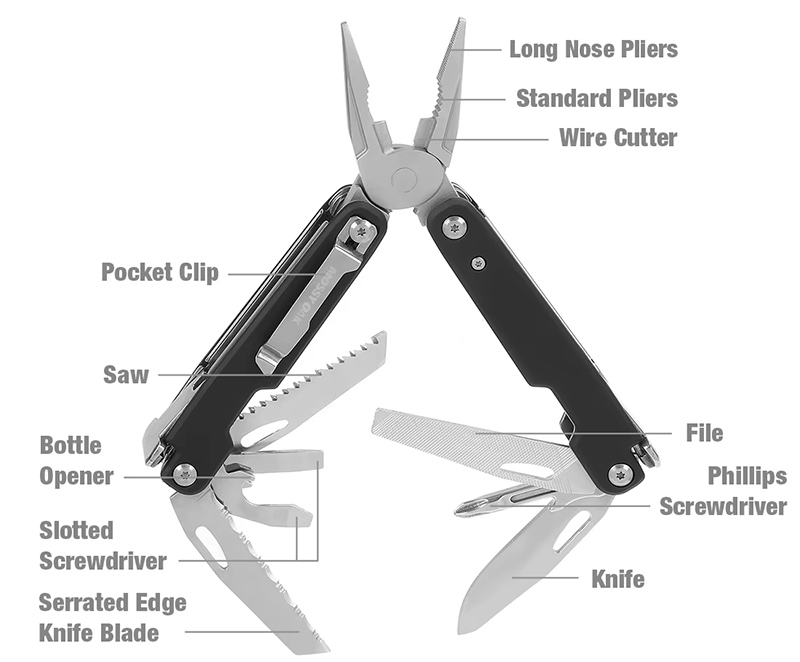 Мультитул из нержавеющей стали MOSSY OAK "21 в 1" (ссылка для РФ). Пассатижи, кусачки, ножи, отвертки с битами и многое другое. Есть держатель на пояс, есть чехол.