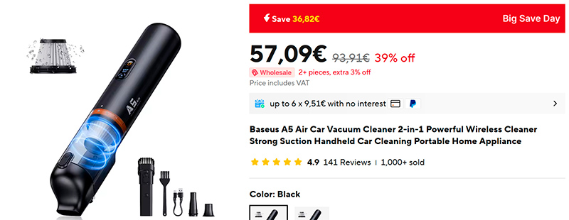 Накрылся у меня автомобильный пылесос, заказал себе новый - Baseus A5 (ссылка для РФ). У него сила всасывания - 12000 Па, это довольно много. Мой первый пылесос имел силу всасывания 3000 Па, и он был слабенький. Второй - 7000 Па, и это уже было более или менее. Может также работать воздуходуйкой, имеет HEPA-фильтр и различные насадки, есть датчик очистки фильтра.