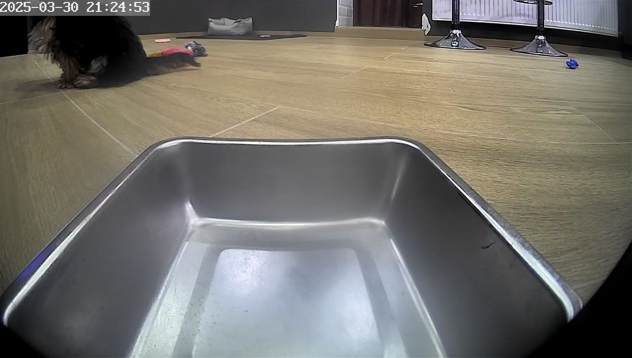 Единственный неочевидный нюанс, на который некоторые жалуются в комментах - камера снимает сверху вниз и направлена на емкость, куда корм сыпется + немного вперед видно, т.е. не получится с помощью неё всё помещение контролировать. Картинка - с моей кормушки сейчас.