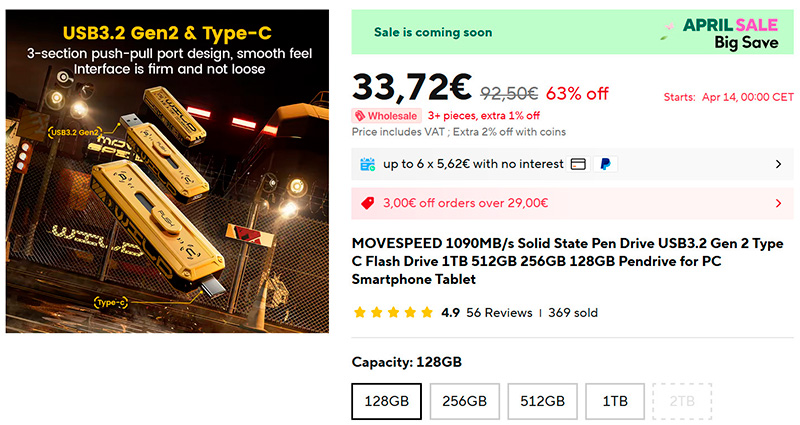 Очень быстрая универсальная флешка MOVESPEED (ссылка для РФ) с выдвижными головками под порты Type-C и USB-A. Поддерживает USB3.2 Gen 2, скорости - до гигабайта в секунду. Емкости - от 12 ГБ до 1 ТБ.