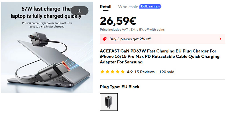 GaN-адаптер ACEFAST (ссылка для РФ) с мощностью 67 Вт, встроенным вытягиваемым кабелем Type-C и двумя портами USB-A и Type-C. Если задействованы все три порта, то вытягиваемый кабель заряжает на мощности 45 Вт, остальные два порта - на мощности в 15 Вт. По отдельности они заряжают, соответственно, на мощности 60 Вт, 65 Вт и 30 Вт.
