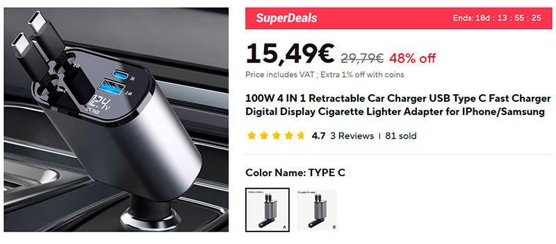 Универсальный зарядный адаптер для машины (ссылка для РФ) мощностью 100 Вт с двумя выдвижными кабелями, двумя портами и индикатором мощности зарядки. Есть две версии - с кабелями Type-C и кабелями Type-C и Lightning.