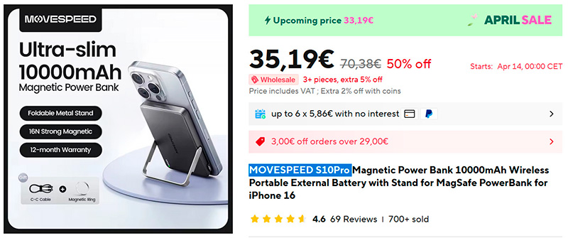 Для смартфонов, поддерживающих беспроводную зарядку (и не только для них) - внешний аккумулятор MOVESPEED S10Pro (ссылка для РФ) на 5000 или на 10000 мАч с беспроводной зарядкой с поддержкой MagSafe. Очень тонкий, есть подставка, в комплект входит магнитное кольцо, которое можно прикрепить к чехлу, и смартфон станет поддерживать магнитное крепление, в том числе - для беспроводной зарядки (если она есть у смартфона).