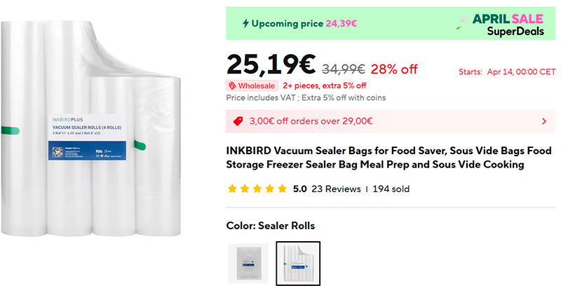 В комплекте к вакууматорам обычно идет десяток пакетов, но это очень мало, так что рекомендую для него сразу купить вот такой комплект (ссылка для РФ) с рулонами разных размеров - их надолго хватит. Ну и если у вас уже есть вакууматор - тем более пакеты пригодятся.