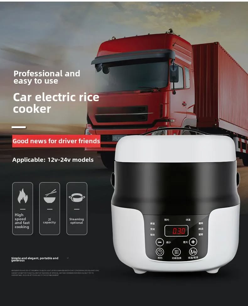 Емкость чаши 2л. Есть модели для легковых автомобилей (12V) и для грузовиков (24V), а также двойного подключения, к авто и к обычной розетке. Есть программы для жарения, варения супа и круп, готовки на пару, подогрева. Размер мультиварки 20х20см. Чаша мультиварки покрыта антипригарным покрытием. В комплекте также есть измерительный стакан и пластиковая лопатка.