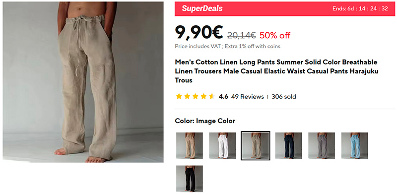 Из той же серии - легкие хлопково-льняные штаны (ссылка для РФ). Размеры тоже европейские. Мне мои L показались чуть великоваты (я на них на фото выше), но там просто покрой такой свободный - видимо, так и задумано. Тоже очень легкие и дышащие.