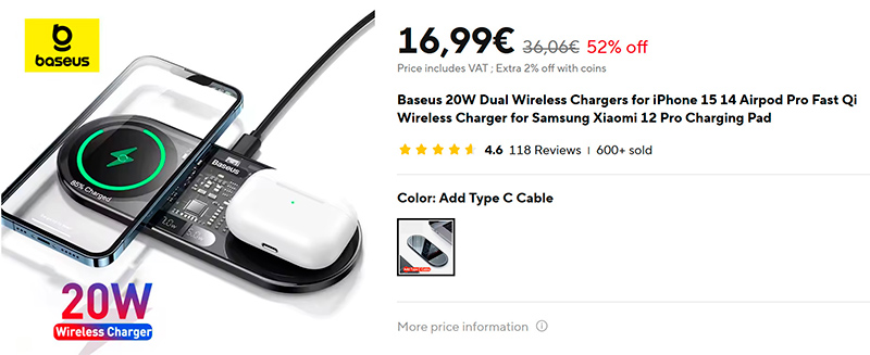 Интересная двойная беспроводная зарядка Baseus (ссылка для РФ): для двух смартфонов, смартфона и часов, смартфона и наушников. Мощность 20 Вт, два дисплея, на которых показывается текущая мощность каждого заряжаемого устройства. В комплекте метровый кабель.