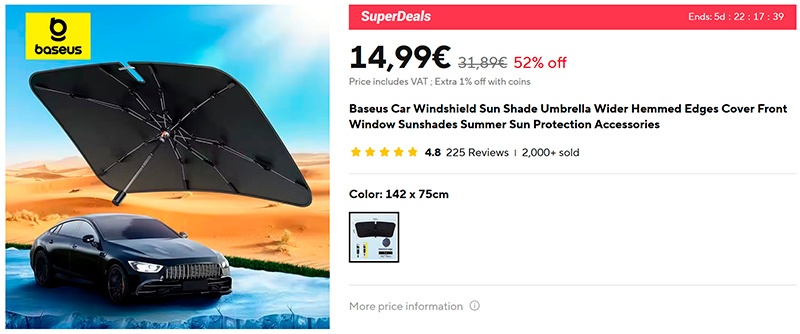 Как раз к наступлению лета - зонтик для ветрового стекла автомобиля (ссылка для РФ), чтобы от солнца не нагревался салон. Такой зонтик намного удобнее разворачивааемой шторки: у меня аналогичный от какого-то unknown производителя - пользоваться было очень удобно, но он где-то за год развалился. Надеюсь, что этот будет более долговечный.