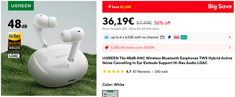 Недорогие TWS-наушники UGREEN T6s (ссылка для РФ). 6 микрофонов, активное шумоподавление, влагозащита IPX5, 10 мм драйверы, Bluetooth 5.4, сенсорное управление, кодеки AAC и LDAC. Работают до 7 часов без подзарядки.