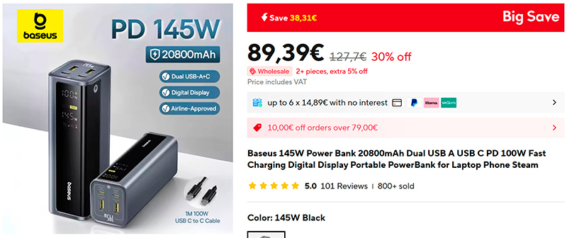 Мощный внешний аккумулятор Baseus PD 145 Вт (ссылка для РФ) для зарядки ноутбуков, планшетов, смартфонов. Ёмкость 20800 мАч, есть дисплей с уровнем заряда и мощностью, четыре порта - два Type-C и два USB-A.