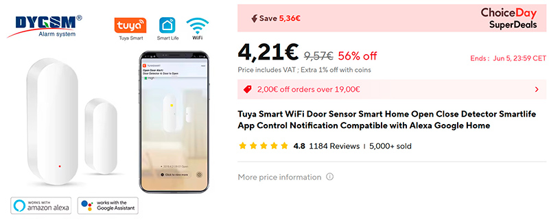 Умный сенсор открывания двери (ссылка для РФ). Подключается к домашнему Wi-Fi и работает со всеми популярными системами: Alexa, Google Assistant, Tuya и SmartLife. При срабатывании приходит уведомление на телефон. Датчик компактный, легко крепится, работает от батареек.