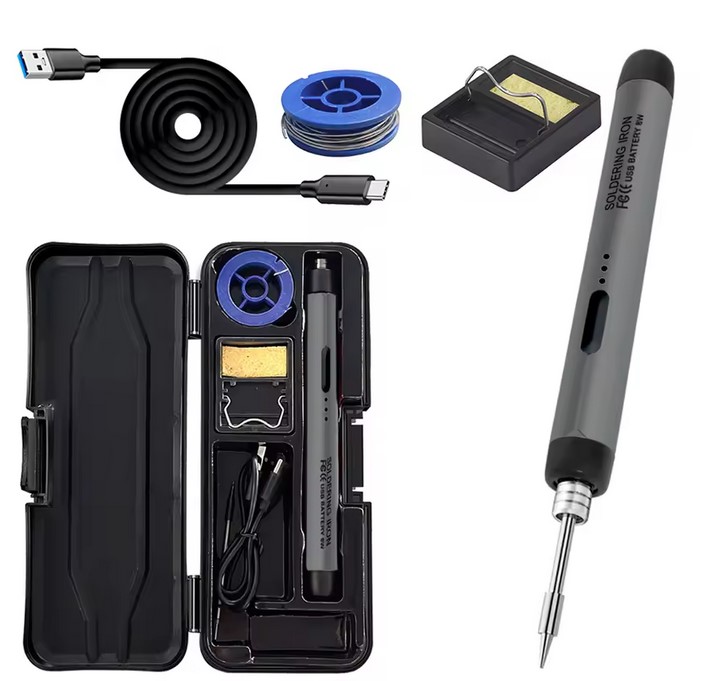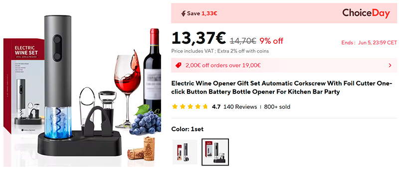 Набор для вина (ссылка для РФ): электрический пробочник, инструмент для срезания фольги, пробка и вставка для горлышка бутылки. Пробочник заряжается через USB-порт.