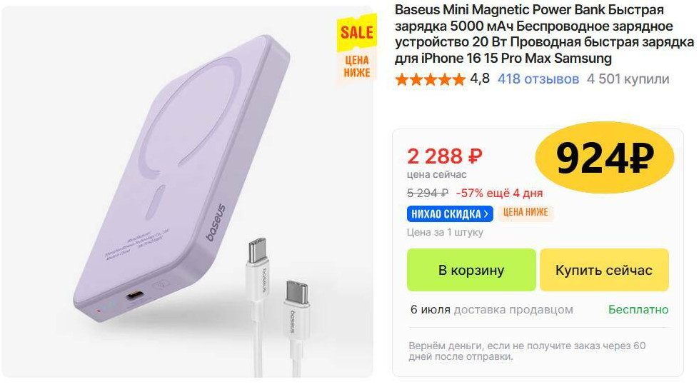 Поддерживает быструю и беспроводную зарядку, компактный и лёгкий, крепится к смартфону при помощи магнита. Мощность 20 Вт, ёмкость 5000 мАч, в комплекте кабель.