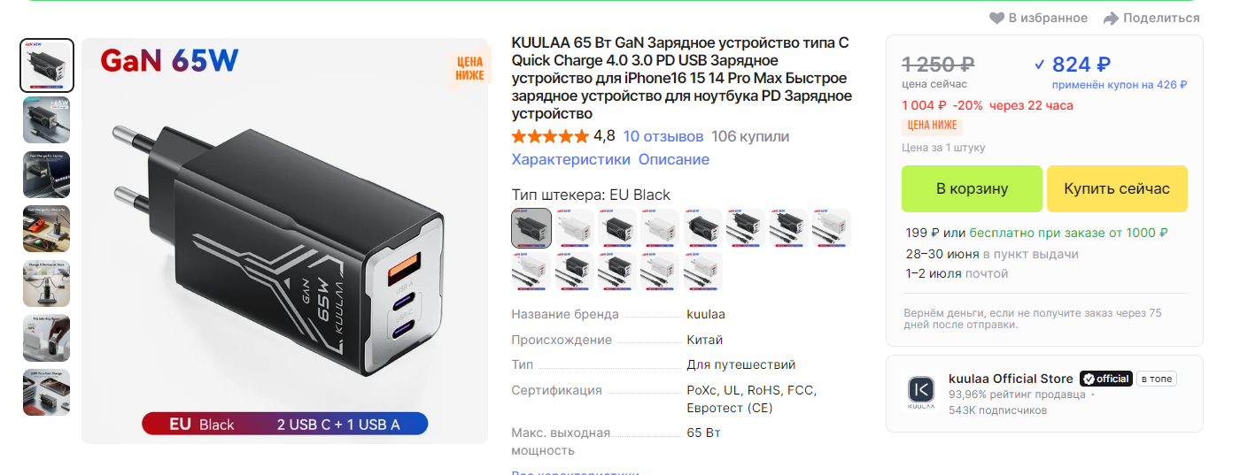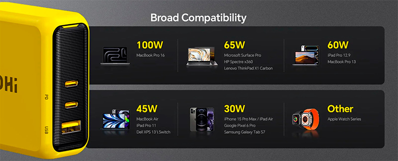 Зарядка с технологией Gan, два Type-C выдают по 65 Вт, а USB-A - до 22.5 Вт. Поддерживает быструю зарядку Power Delivery и QC. Все необходимые защиты есть.