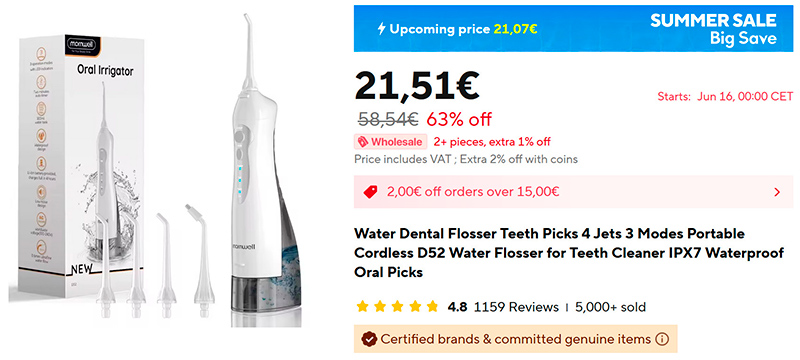 Портативный ирригатор для ухода за полостью рта. Это устройство желательно иметь всем: ирригатор струей воды массирует десны и очищает зубы, вымывая частички, до которых не дотянулась щетка. Особенно полезно такое устройство, если у вас наблюдается кровоточивость десен - ирригатор от этого быстро избавляет, по себе сужу. У меня была эта проблема, начал пользоваться ирригатором каждый день - больше кровоточивости десен нет совсем.