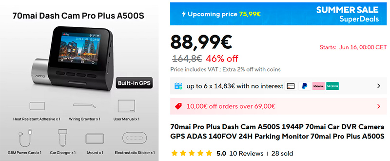 Новая модель популярного видеорегистратора 70mai Pro Plus A500S. Есть небольшой дисплей, разрешение 2592x1944, встроенный GPS, ADAS, режим парковки, двухканальная запись (поддерживает заднюю камеру). Разные варианты комплектации: есть полный комплект с задней камерой и parking kit.