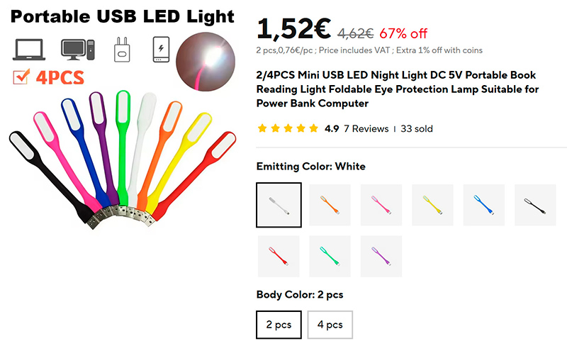 Маленькие гибкие универсальные светильнички, подключающиеся к USB-порту. Их можно использовать с ноутбуком, ПК, внешним аккумулятором. В комплекте 2 или 4 штуки. Несколько вариантов цветов.