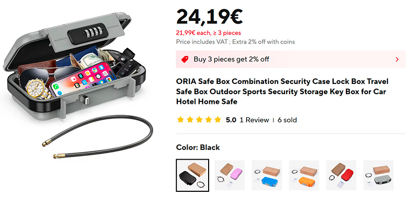 Портативный сейф ORIA для различных применений. Кодовый замок на 4 цифры, тросик для крепления.