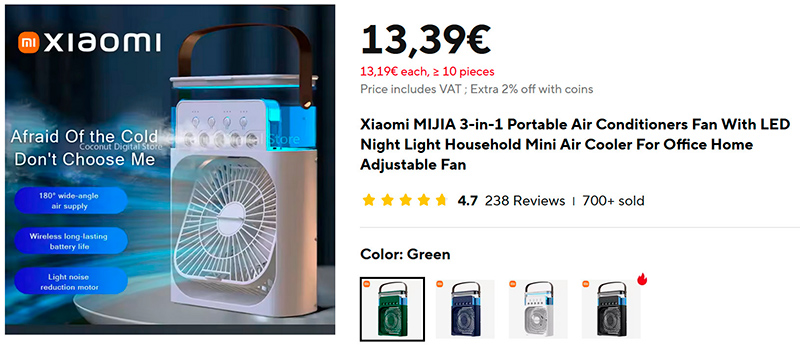Как раз под летнюю жару - новый настольный вентилятор-увлажнитель Xiaomi Mijia. Туда заливается 600 мл холодной воды, и он будет ее распылять, создавая прохладу. Три режима обдува, семь вариантов подсветки, питание от USB. Более 700 продаж, рейтинг 4,7.