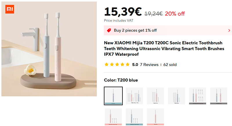 Дешевая электрическая зубная щетка Xiaomi Mijia T200. У нее 4 режима работы и скорость в 31 000 вибраций в минуту, влагозащита IPX7 позволяет мыть щетку под душем. Встроенный аккумулятор держит заряд до 25 дней.