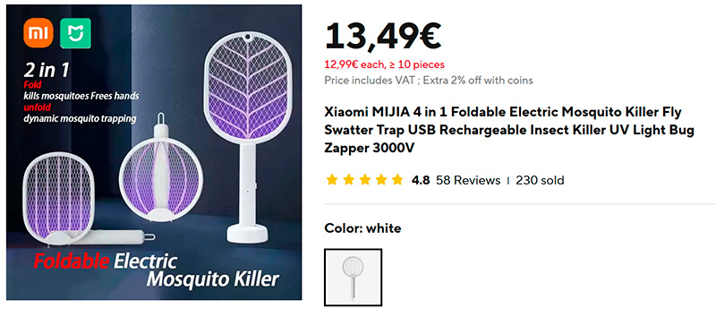 Электрическая мухобойка для быстрого и эффективного уничтожения насекомых. Может светить ультрафиолетом, привлекая насекомых: ее можно поставить рядом и использовать в качестве ловушки. Заряжается через USB.