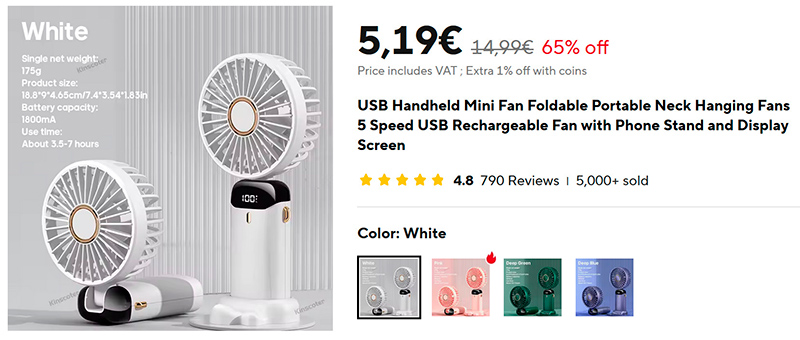 И еще о вентиляторах. Я уже давал ссылку на вот такой настольно-переносной вентилятор. Я его себе заказал, он приехал и оказался очень даже удобным. У меня как раз помер старый компактный вентилятор, который крепился к столу прищепкой, и я стал использовать вот этот. И он оказался даже удобнее старого. Его можно придвинуть к себе поближе, у него 5 уровней обдува (я использую 2-й), он не слишком громкий, а главное - он еще и переносной, и я его беру с собой на кухню, когда иду обедать (я не люблю лишний раз включать кондиционер, когда без него можно обойтись). Аккумулятора у него хватает часов на 12 работы на 2-м уровне, а вот чего у него нет - режима автоматического поворота. Но мне этот режим для такого вентилятора и не нужен.