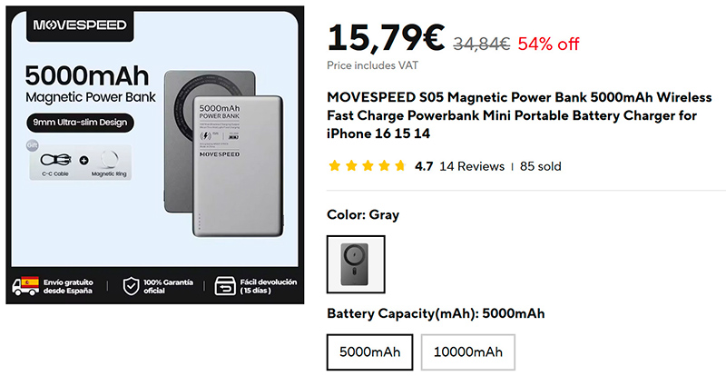 Ультратонкий и легкий аккумулятор MOVESPEED на 5000 мАч для проводной и беспроводной зарядки MagSafe. Толщина всего 0,9 см и вес 105 г. Обеспечивает проводную зарядку PD мощностью 20 Вт и беспроводную зарядку мощностью 7,5 Вт. Такой аккумулятор можно просто примагнитить к корпусу смартфона и продолжать смартфоном пользоваться.