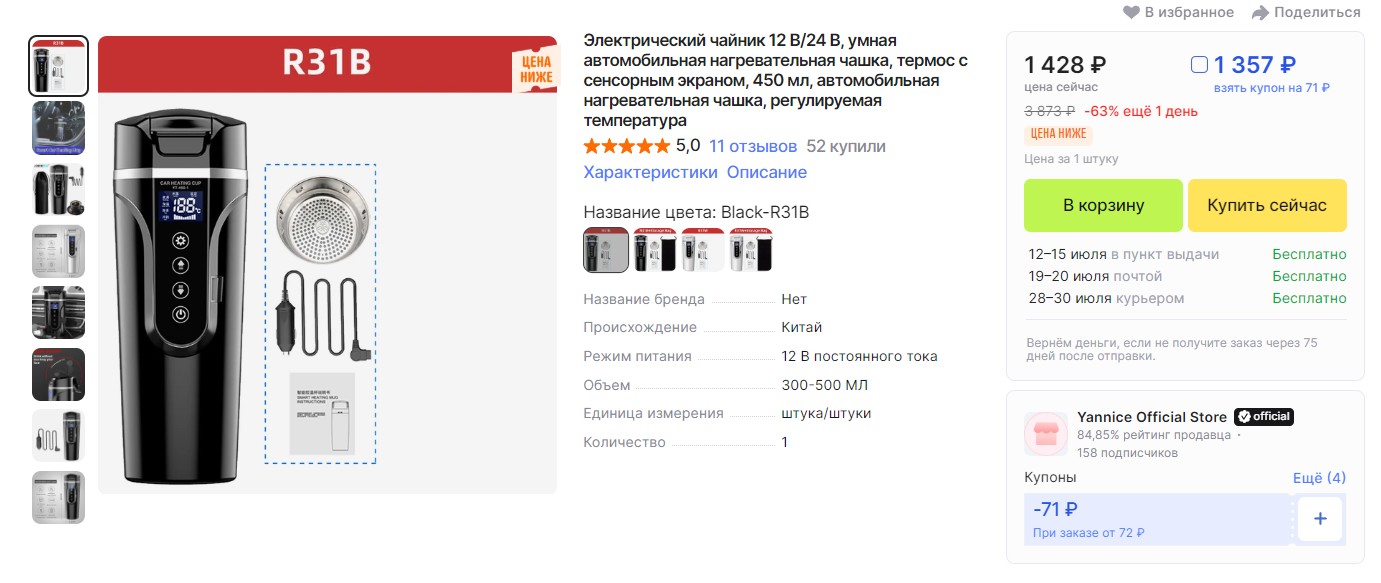 Объём 450 мл, имеет встроенный LED-дисплей с указанием температуры напитка, также есть клавиши управления для выставления необходимых параметров приготовления, питается от 12В прикуривателя, в комплекте чехол для хранения.