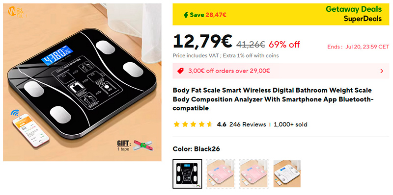 Умные весы, поддерживающие работу с приложением на смартфоне. Измеряют кучу всяких параметром методом биоимпеданса. Более 1000 продаж, рейтинг 4,6. Три варианта цветов.