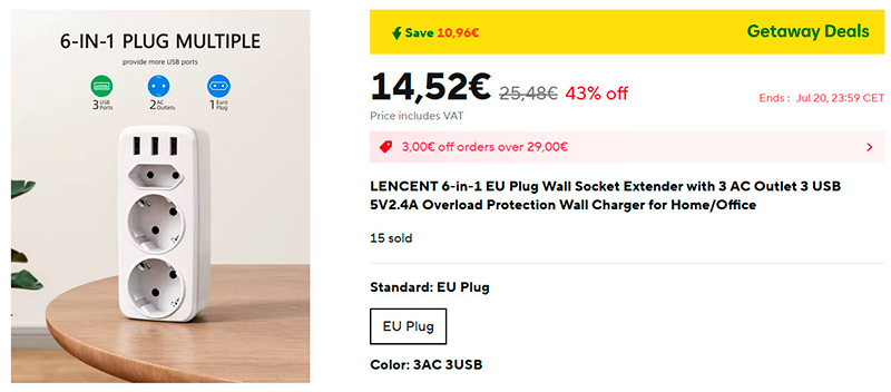 Удобный тройник "6 в 1". Три розетки и три порта USB-A мощностью в 15 Вт.