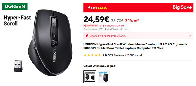 Новая беспроводная мышка от Ugreen с гипербыстрым скроллингом. Есть кнопка переключения DPI (максимальная точность - 5000 DPI), эргономичный дизайн, поддержка подключения через адаптер и по Bluetooth 5.4, есть трекбол.