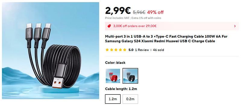 Давно хотел заменить старый кабель "3 в 1", где три разных головки, на "3 в 1", но чтобы это были только Type-C. Нашел такой вариант у Baseus, но что-то стоит больно круто - мне показывает больше 20 евро. Поискал - и в конце концов нашел другой вариант, стоящий буквально копейки. И там два варианта цветов и два варианта размеров.