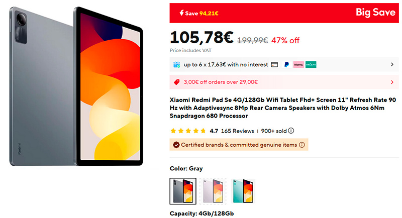 На хороший планшет Redmi Pad SE совсем упала цена - теперь он стоит чуть больше 100 евро. Планшет очень хорош, я делал его обзор. В данном варианте памяти всего 4/128 ГБ, но планшет поддерживает microSD. Но если добавить 30 евро, то вот уже версия с памятью 8/256 ГБ