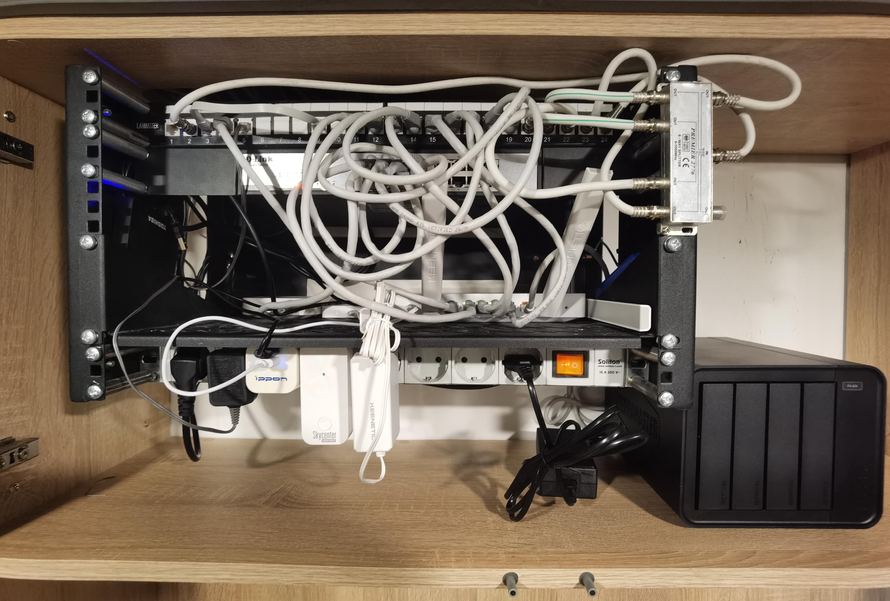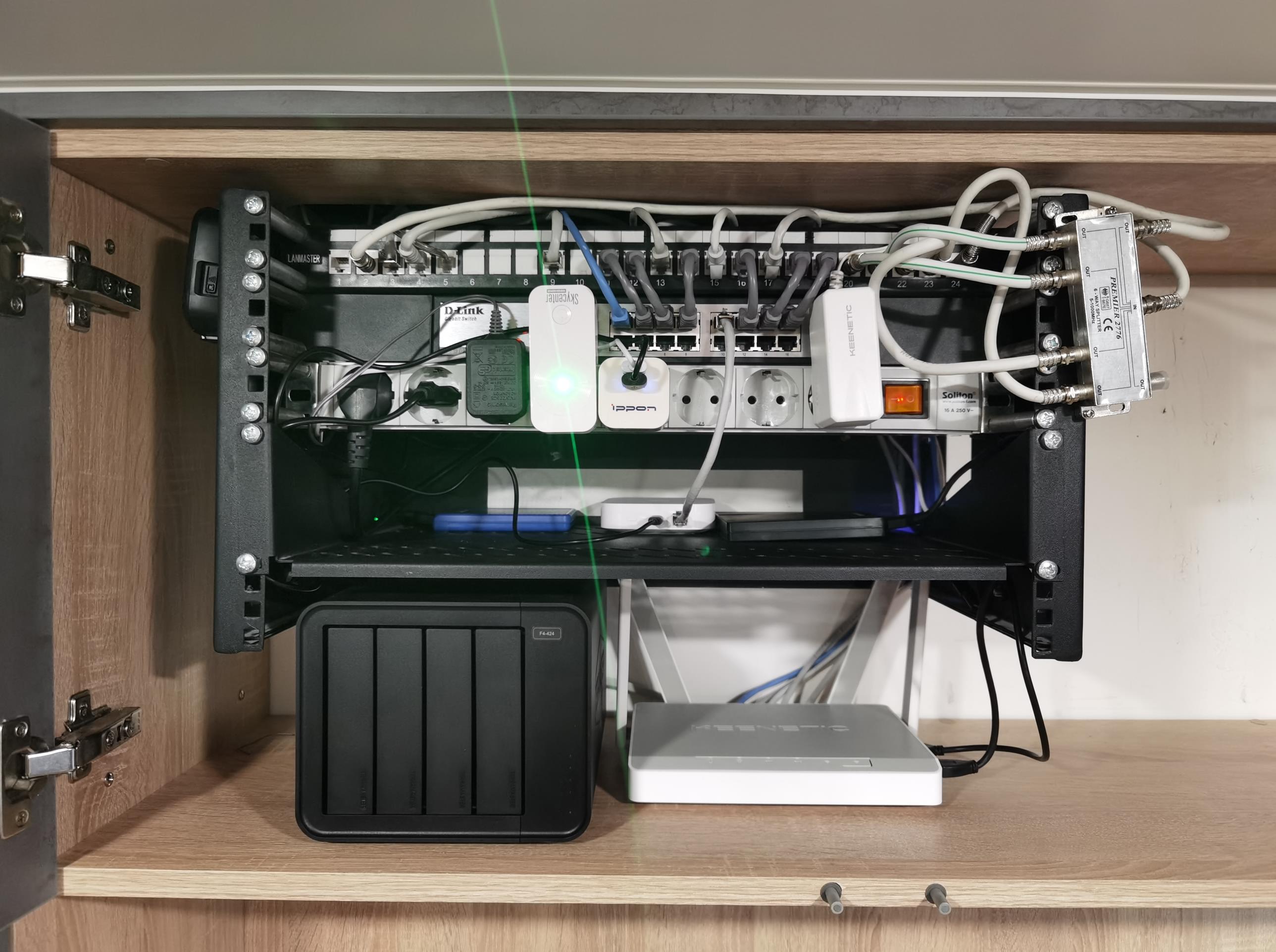 Мне не очень нравится, когда вся эта требуха на виду - изначально хотел сделать отдельно всю слаботочку в одном закрытом месте. Ну и дверца же из ЛДСП, а не из металла, так что особо не мешает, я думаю. По факту, роутер стабильно покрывает 4-х комнатную квартиру в 80 кв. м. (кроме одного "медвежьего угла", который пришлось повторителем накрыть - и то, только из-за одного имеющегося там устройства со слабым Wi-Fi-модулем) со стенами из железобетонных панелей. Почти 30 устройств по wi-fi чувствуют себя отлично, а всего около 40 устройств к роутеру подключено. Но, как Вы сами отметили, всё критически важное (ТВ, медиаплееры, ПК, NAS) подключено по проводу. Ну да, Wi-Fi 6 на смартфонах не во всей квартире, а только в прямой видимости или через одну стенку от роутера, но мне такие скорости и не нужны - Wi-Fi 5 вполне достаточно.