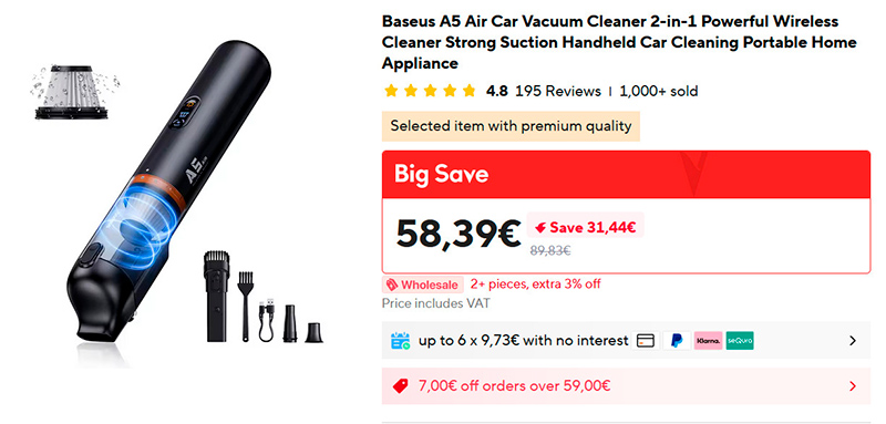 Компактный автомобильный пылесос Baseus A5: высокоскоростной бесщеточный двигатель с мощностью всасывания 12000 Па, обновленная технология Cyclone, легкая очистка, предупреждение о замене фильтра, дополнительные насадки для очистки различных поверхностей.