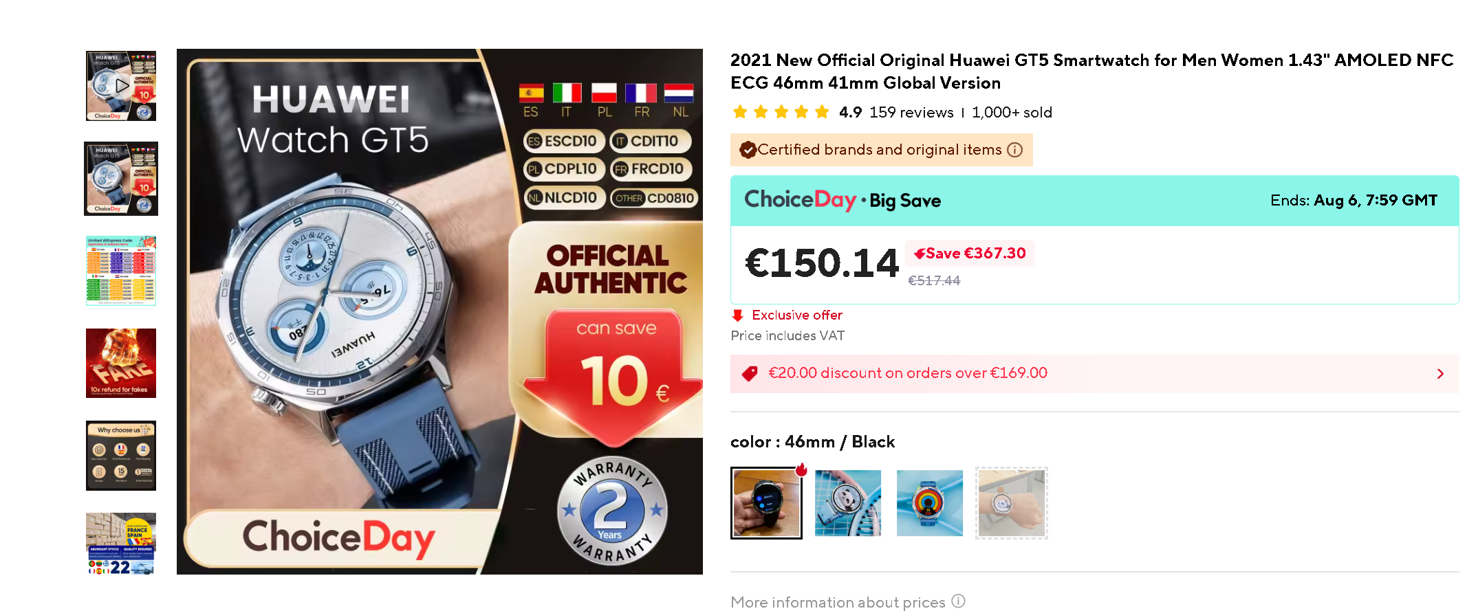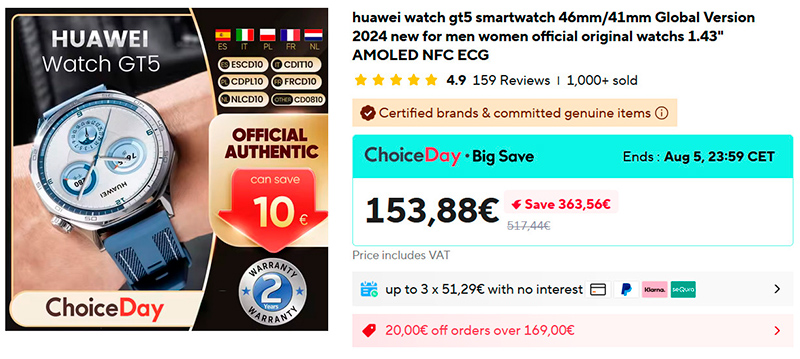 Отличные умные часы Huawei Watch GT 5 (мой обзор) на рынке появились в конце прошлого года и стоили €250. На Amazon они сейчас стоят в районе €220, а на Aliexpress их можно найти всего за €154, и для таких часов это отличная цена! У продавца более 1000 продаж этих часов, средний рейтинг 4,9.