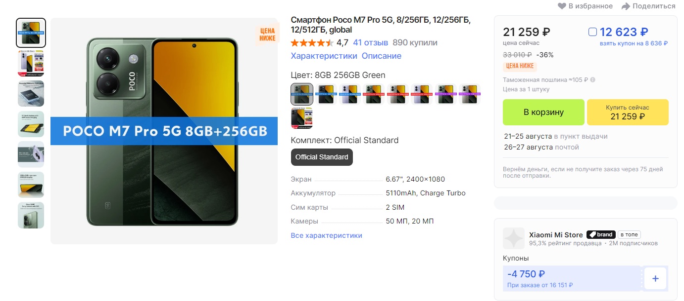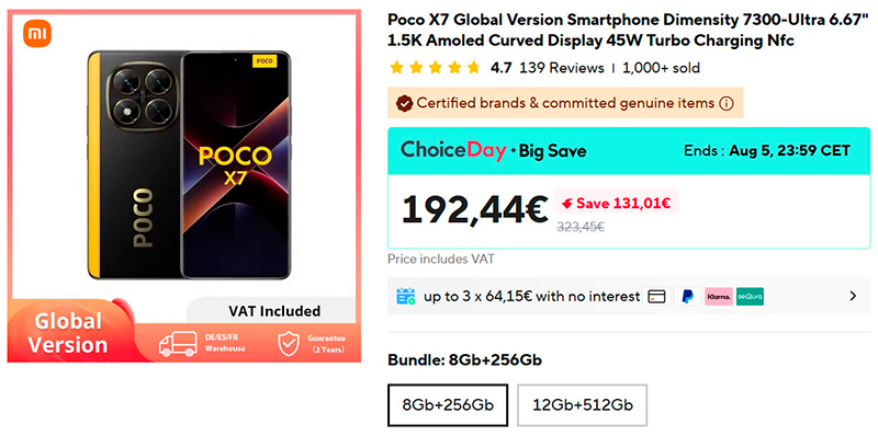 Очень хорошая цена на один из самых популярных смартфонов Poco - Poco X7: всего €193 за версию 8/256 (€217 за версию 12/512). На Амазоне версия 8/256 дороже на 40 евро. Я делал обзор версии Poco X7 Pro: у него мощнее платформа, более емкий аккумулятор, такая же камера, но стоит в полтора раза дороже.