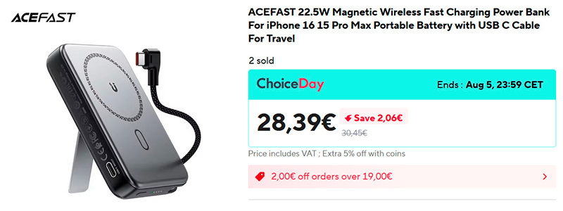 Внешний аккумулятор ACEFAST на 10000 мАч с MagSafe и поддержкой беспроводной зарядки на 15 Вт и проводной зарядки (есть встроенный кабель) мощностью 22,5 Вт. Есть подставка, так что смартфон можно примагнитить к аккумулятору, поставить на стол и пользоваться.