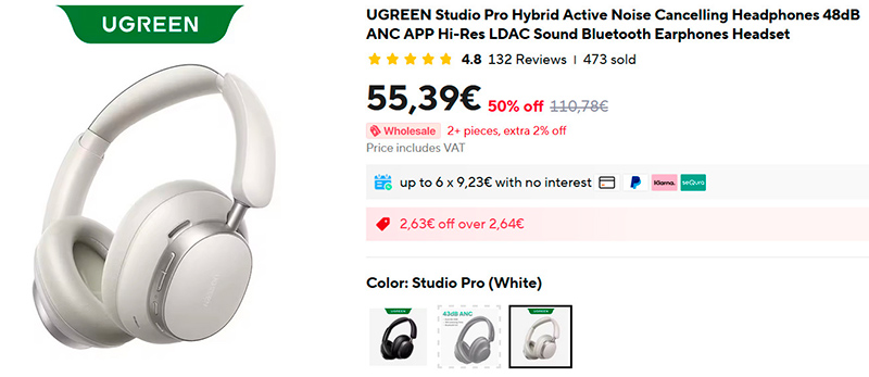 Новая модель наушников-полноформатов с активным шумодавом - UGREEN Studio Pro. Предыдущая модель называлась Ugreen HiTune Max5c, и здесь по сравнению с ней сделаны определенные улучшения, при этом подросла цена. Особенности: активный шумодав 48 дБ с различными режимами, задержка 0,06с, эффект окружающего звука, 4 динамика (40-мм низкочастотники, 12-мм высокочастотники), время работы от одного заряда - 120 часов (80 часов со включенным шумодавом), Bluetooth 6.0. Варианты цветов - черные и белые.