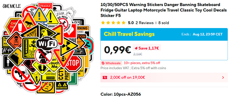 Для любителей стикеров - наборы из 10, 30 или 50 самых разнообразных стикеров от полезных до прикольных. Для чемоданов, ноутбуков, машины, дверей и любых других предметов. Размер - 5х5 см. Пишут, что качество хорошее: не облезают и не выгорают.