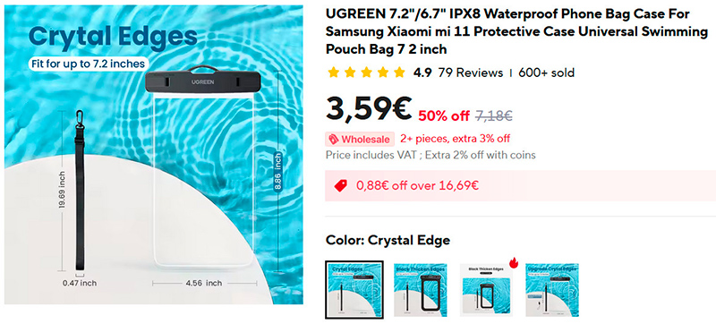 Водонепроницаемые чехлы для смартфонов от Ugreen. Для смартфонов размером до 6,7" и до 7,2". Полезная штука где-нибудь на море. А то когда даже влагозащищенный смартфон плюхается в море - это, знаете ли, чревато.