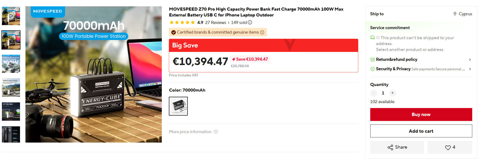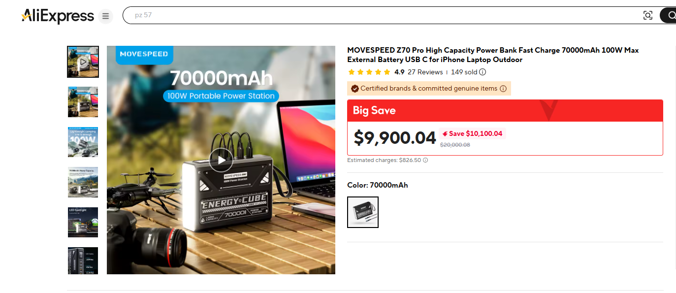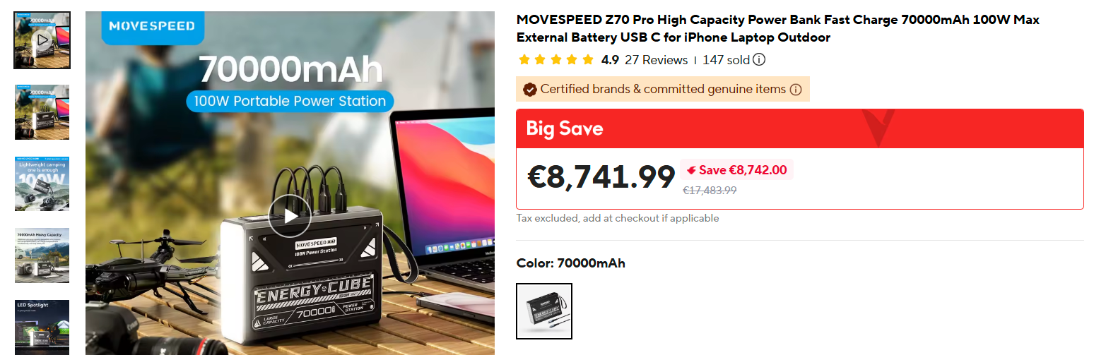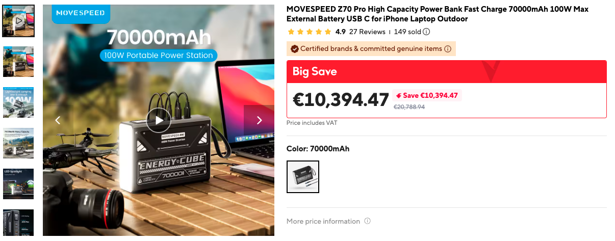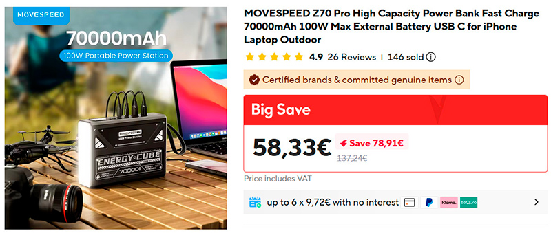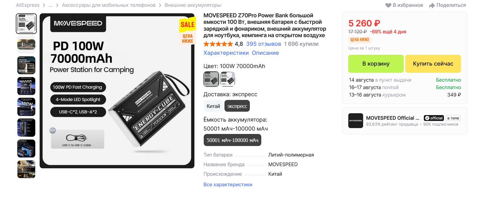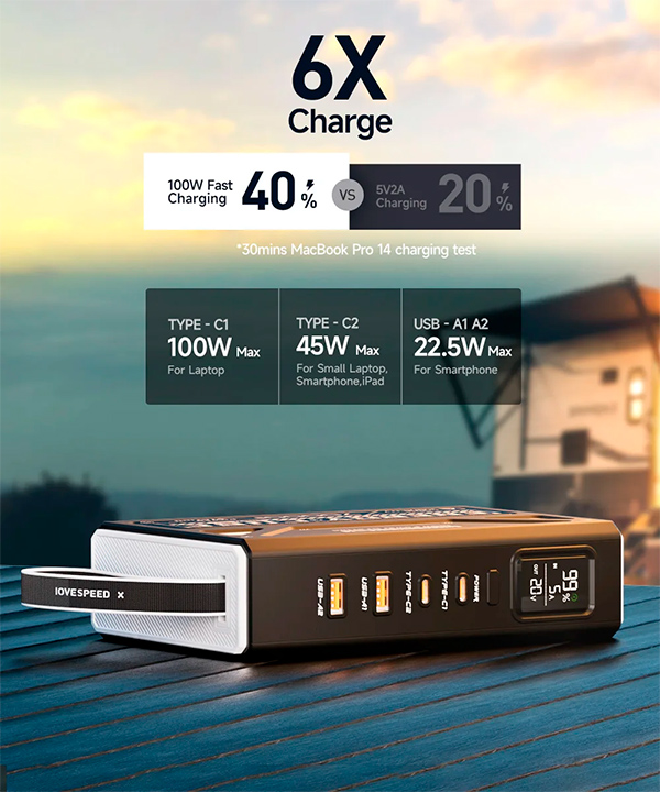 Совершенно бомбический аккумулятор MOVESPEED Z70Pro емкостью аж 70000 мАч и мощностью 100 Вт (есть версия с мощностью 140 Вт, она незначительно дороже), Power Delivery 3.1. Для тех, кому часто приходится заряжать ноутбук, также как очень емкий стационарный аккумулятор для дома, для машины, для кемпинга. MacBook Pro заряжает на 50% за 30 минут. Два порта USB-A и два порта Type-C, одновременно может заряжать до четырех устройств. Есть дисплей, на котором показывается процент заряда и параметры зарядки. Понятное дело, штука увесистая - 1,3 кг. Такая бандура может 15 раз зарядить айфон, 4 раза iPad Pro, 2 раза MacBook Pro 16", 11 раз флагманский смартфон Samsung.