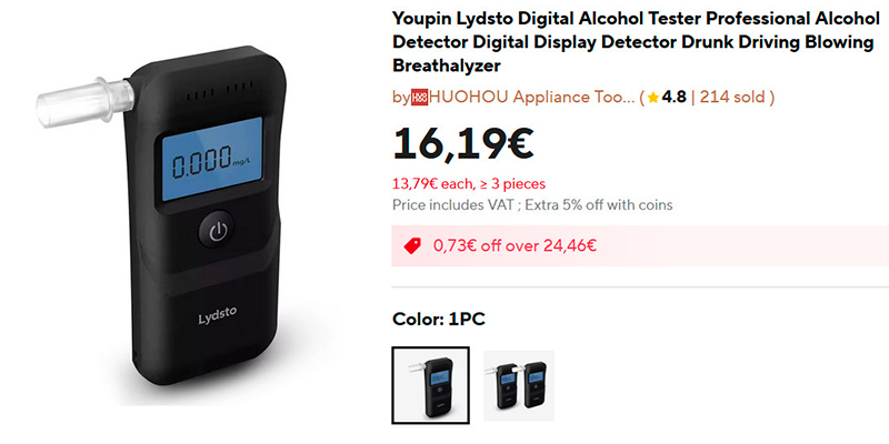 Простенький, но вполне эффективный алкотестер, который измеряет содержимое алкоголя в выдыхаемом воздухе в мг/л. (На Aliexpress полно алкотестеров, которые меряют в других единицах, и это очень неудобно.)