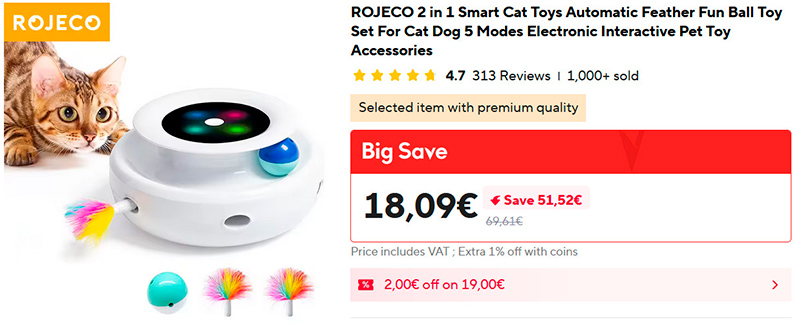 Ваш котик скучает дома, пока вы находитесь на работе? Подарите ему вот такую продвинутую игрушку для котов. По ней бегает мячик, игрушка шевелит перышком, мигает огоньками и, в общем, всячески развлекает домашнего любимца. Работает от USB или батареек, так что можно поставить где угодно.