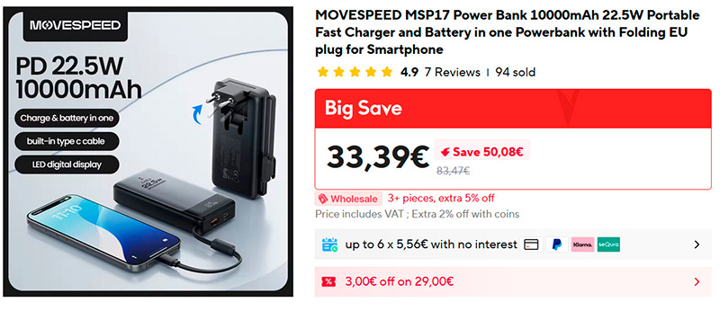 Новый интересный внешний аккумулятор MOVESPEED MSP17. Емкость - 10000 мАч, мощность - 22,5 Вт, встроенный кабель Type-C (он же - петелька для переноски), два порта - USB-A и Type-C, дисплей, показывающий процент заряда, встроенная европейская вилка для включения аккумулятора в сеть для зарядки. Также он может работать и качестве адаптера для зарядки.