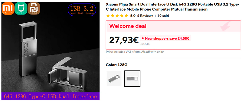 Флешка от Xiaomi на 64 или 128 ГБ. На Aliexprfess полно флешек якобы от Xiaomi, но эта действительно брендовая и единственная, другие модели они не выпускали. Два порта - под USB-A и Type-C, поддержка USB 3.2, скорости - до 150 МБ/сек. Алюминиевый корпус, ушко для использования в качестве брелока.