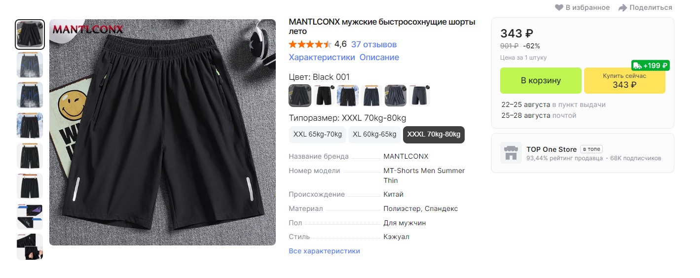 Удобная модель из полиэстера, не стесняет движения, есть карманы, быстро сохнут. На выбор несколько размеров и расцветок. Отзывы хорошие.
