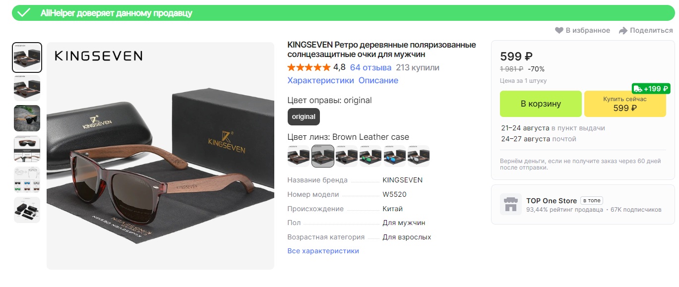 Имеют деревянные дужки, поляризованные линзы из поликарбоната с защитой от ультрафиолетового излучения UV400, на выбор доступны разные цвета линз.